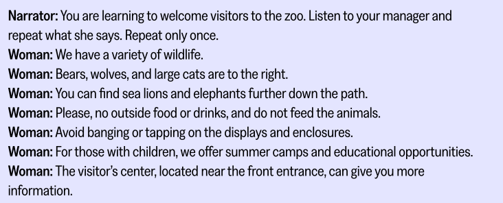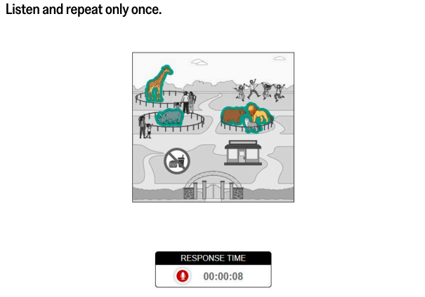 هر چه تسک جلوتر رود، جملات طولانی تر و پیچیده تر می شوند. برای هر جمله 8 تا 12 ثانیه فرصت ضبط صدا هست. جملات باید تکرار دقیق آن چه گفته شده باشند و در عین حال قابل فهم (an accurate repetition and clearly intelligible) باشند. شما هیچ متنی بر روی صفحه نمایش خود نمیبینید. در عوض، تصویری با موضوع مکان (مانند باغ وحش، دفتر دانشگاه یا موزه) روی صفحه نمایش داده میشود و صدایی جملهای را با صدای بلند میخواند. سپس شما آن را یک بار تکرار میکنید.